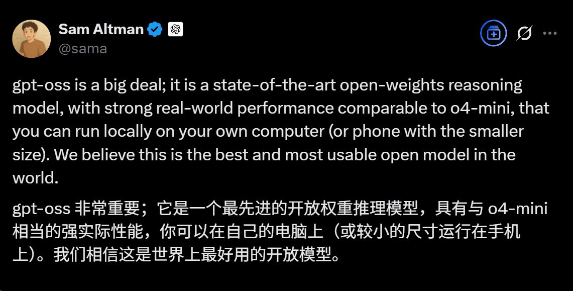 当天压轴登场的OpenAI则选择以“开源”破局。该公司推出了两款开放权重模型:gpt-oss-120b和gpt-oss-20b,标志着其时隔六年重返开源赛道。