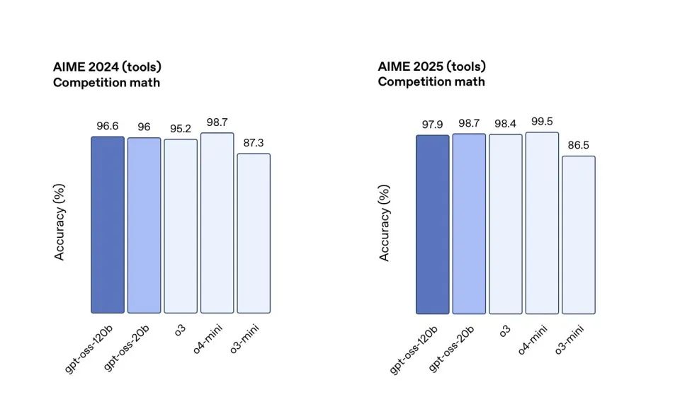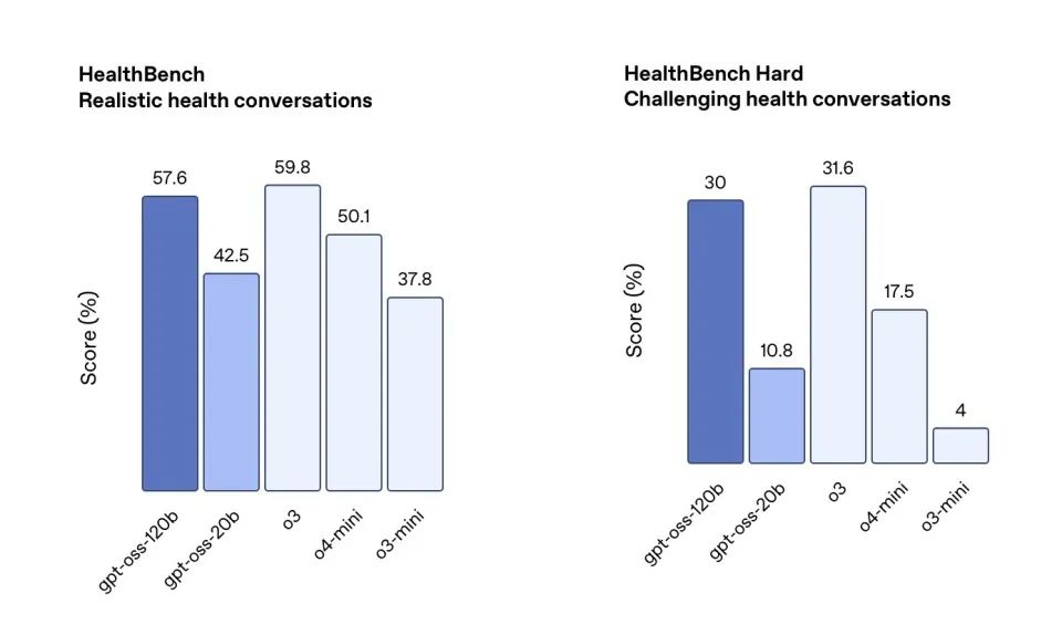 根据OpenAI发布的技术报告,这两款大模型均为纯文本语言模型,在文本处理、代码生成、数学问题求解等领域表现出色。尤为值得关注的是,gpt-oss-120b在多项基准测试中的表现,媲美甚至超越了专有模型o4-mini。较小的gpt-oss-20b则与o3-mini性能相当,在AIME和HealthBench等测试中表现更佳。