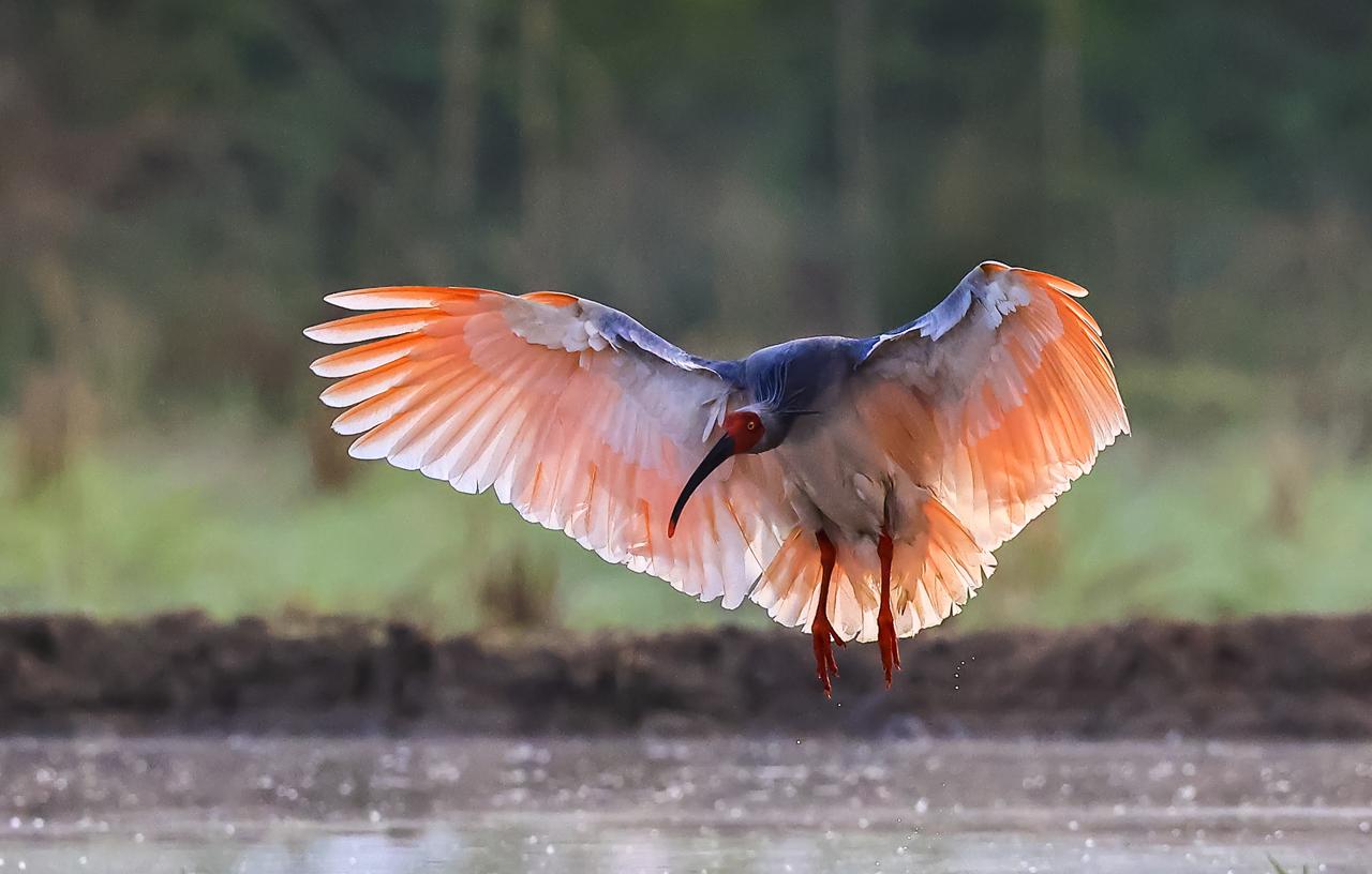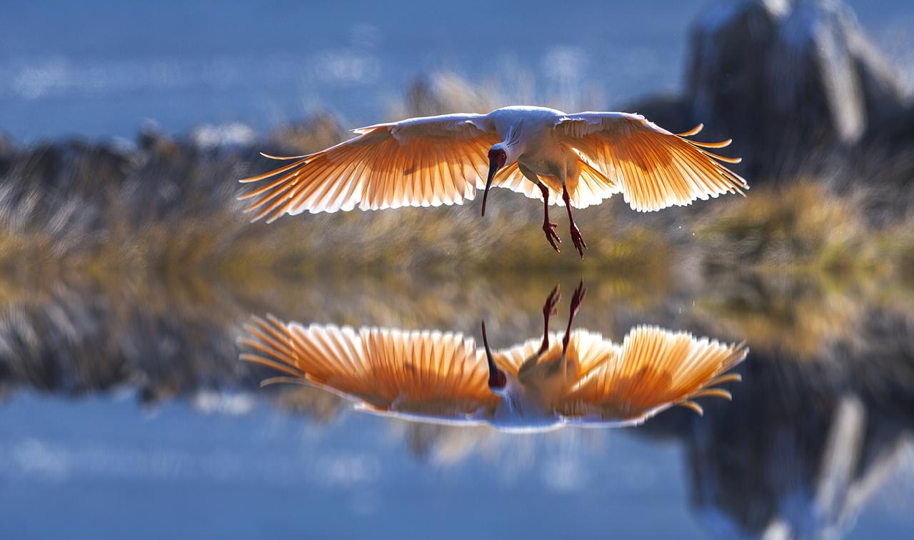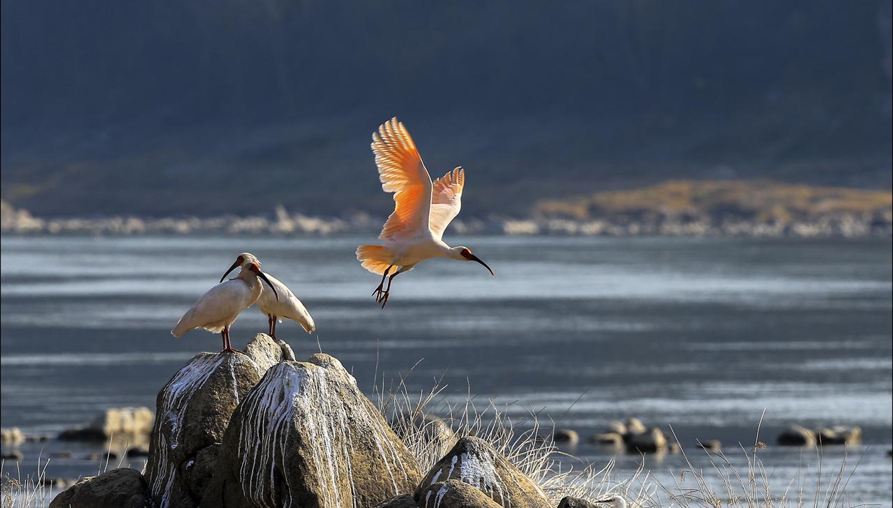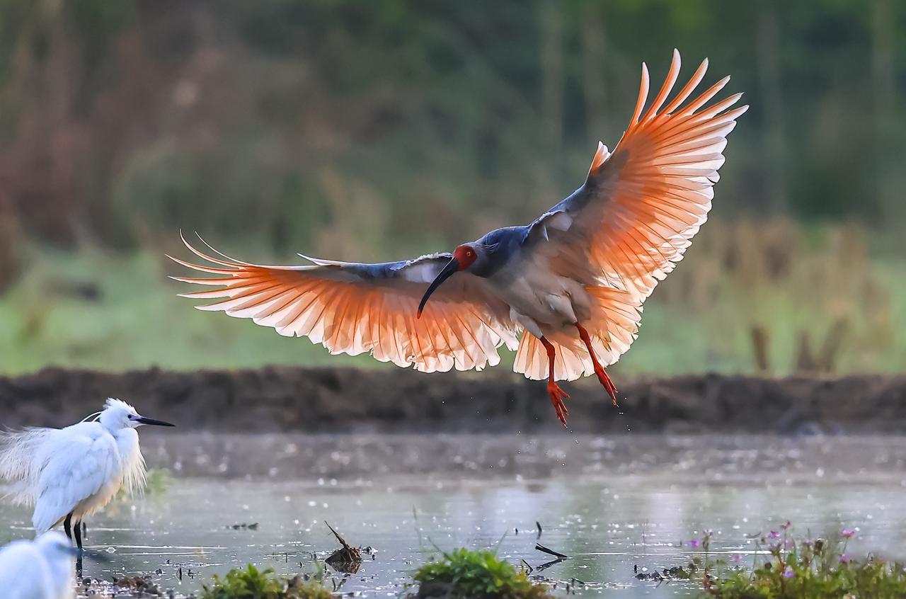 朱鹮喜欢栖息在开阔的水田、沼泽地以及山区溪流附近。它们通常以小鱼、泥鳅、蛙类、昆虫等为食,在浅水中悠然踱步,用那敏锐的长嘴迅速捕捉猎物。朱鹮生性较为宁静,飞行时姿态优雅,振翅缓慢而有节奏,展现出一种独特的美感。